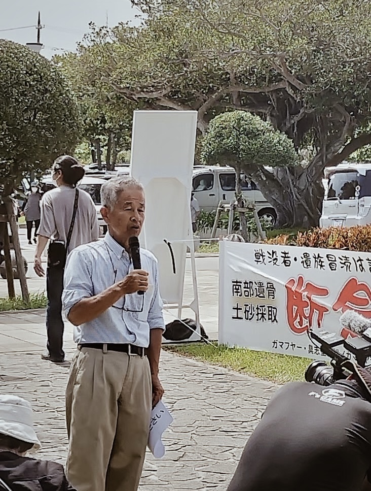具志堅さんは沖縄戦没者の遺骨を40年以上にわたり収集し、これまでに400名の遺骨を探し出しておられます。普天間移転先の辺野古では埋立が始まりましたが、軟弱地盤の故に大量の土砂が必要となり、未だ3,000名以上の遺骨が眠っていると言われている、沖縄南部の土砂を用いることが計画されています。具志堅さんは「戦没者の骨を、米軍基地の埋め立てに利用するなど考えられない」と、抵抗運動を続けておられ、慰霊の日に合わせてハンストを決行されていました。