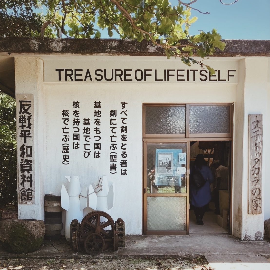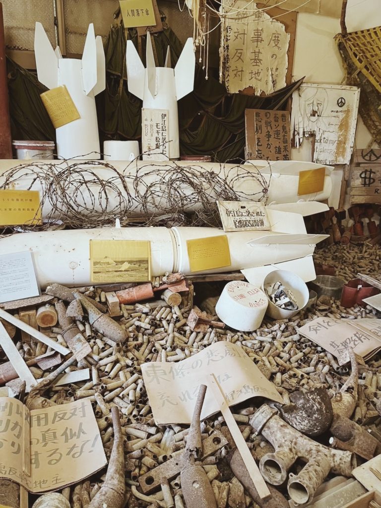 伊江島で生涯、対話を基に非暴力で土地闘争を行ってこられた阿波根昌鴻さんが設立された施設「わびあいの里」を訪れました。障害者への仕事の提供や人々の交流の場となる「福祉村」を目指し開設された場所です。その中に「ヌチドゥタカラ(命どぅ宝)の家」という反戦資料館があります。平和のためには戦争の原因を知らなければならないという阿波根さんの考えを基に、戦争の遺品や土地闘争の記録など、様々な展示品が置かれていています。